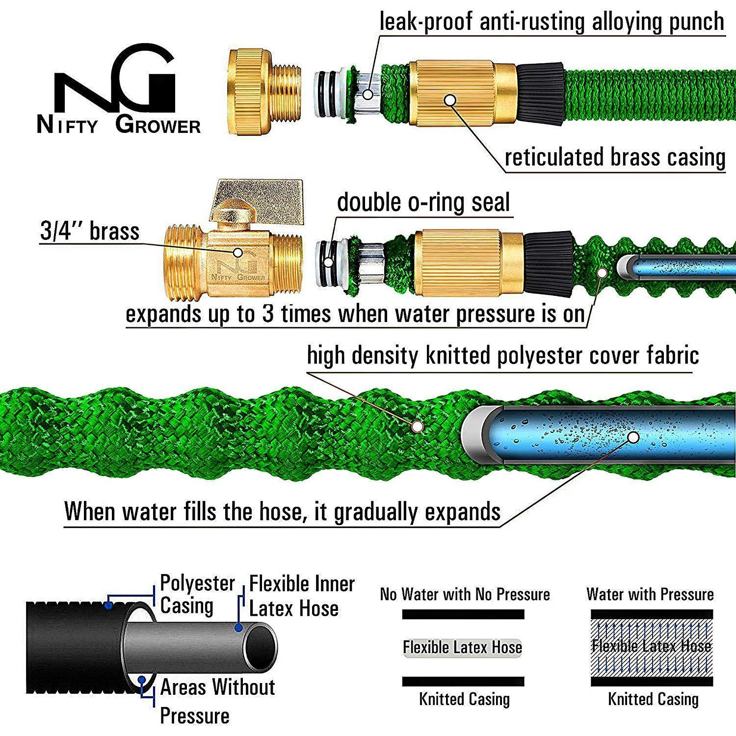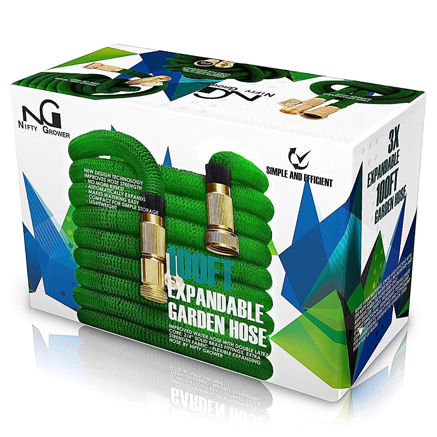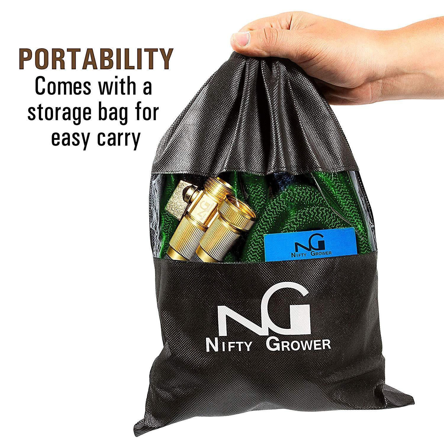 Nifty Grower 100ft Garden Hose - All New Expandable Water Hose with Double Latex Core 3/4" Solid Brass Fittings Extra Strength Fabric - Flexible Expanding Hose with Storage Bag for Easy Carry