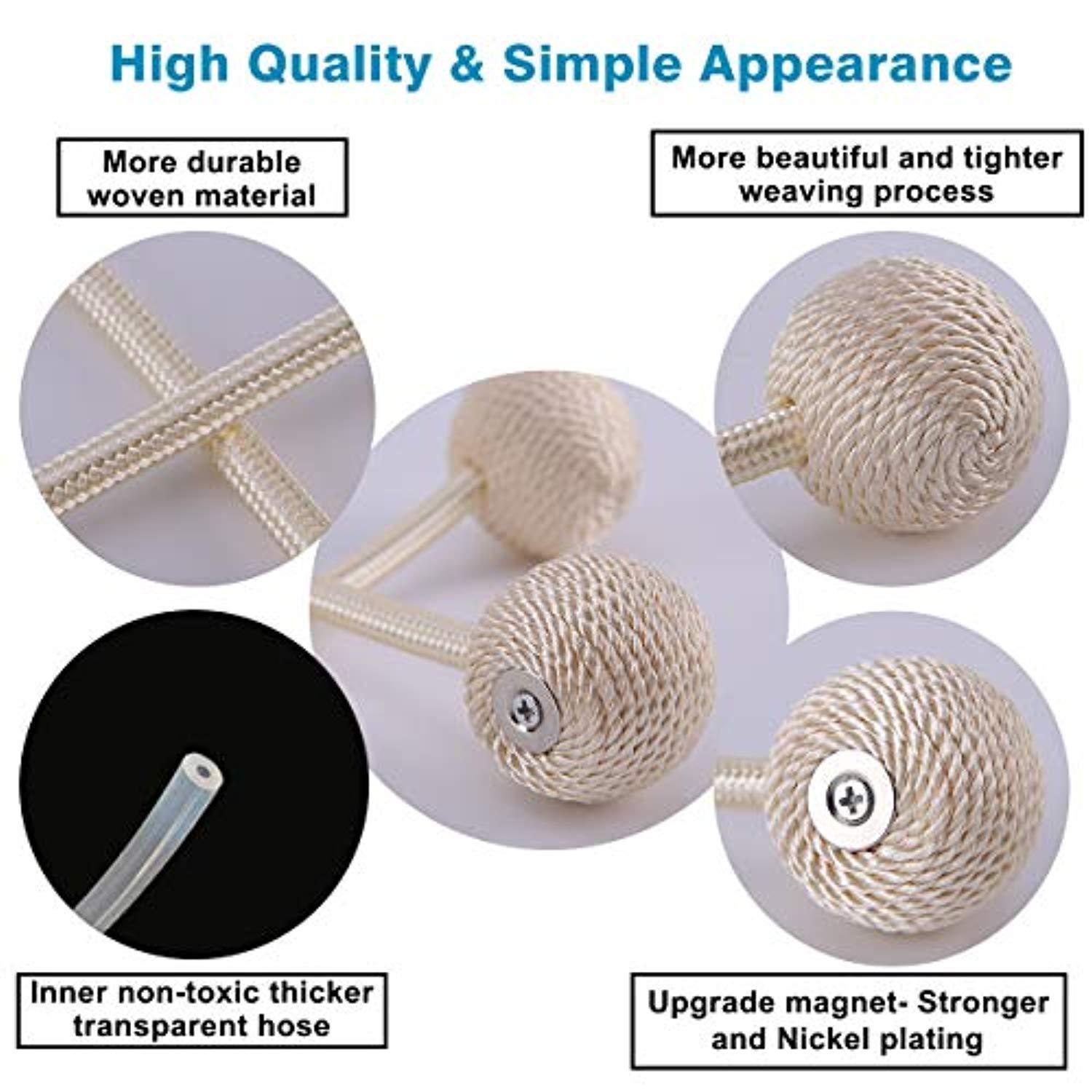 Multiple Clips Ways & Add Style to Your Window-- Half-tie or all-tie on thick and thin blackout panel, sheer panel. These tiebacks could show different style to your curtains, Perfect for living room, bedroom, kitchen, dinning room, bathroom, French door and office, etc. Adjust Length Freely & Meet Daily Use Size-- Total length 17 inch, ball's diameter is 1.4 inch, could be twisted to adjust the length to meet your need, so no need to worry about the size is too big. Suitable for all thick blackout curtains, shower curtains or thin sheer curtains. Simple Elegant Style &With Strong Magnetic-- With beautiful woven texture appearance, compact as well as solid without loose and fall off. Upgrade strong magnet with nickel plating which is smooth and anti-rust, perfect for protecting your draperies. Easy & Convenient to Use-- No need to use hook, punch and install, very easy to use without damaging your walls and need not worrying about the hook will hurt your children. It is great alternative to wall-mounted hooks, and could be tie on anywhere. What Will You Get-- Package include 6 pieces magnetic curtain tiebacks, more cost-effective than buying alone, providing you with enough clips to organize and decorate your curtains. And We have worry-free 36 months warranty refund and friendly customer service.