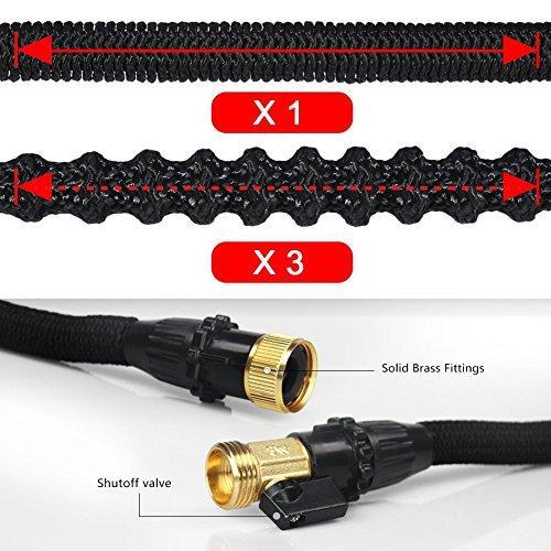 3 TIMES EXPANSION : This 17 ft expandable hose can expand 3 times to its original hose length when water pressure is on, and shrinks to original pipe length when it’s off. The expendable hose will never tangle, twist or kink.