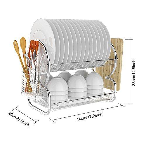 【MODERN DISH RACK 】: The two tier dish rack,S-shaped,unique and chic,size upgrade,up to 17" long.Top Tier places up to 14 pcs plates; down tier places up to 30 pcs bowls; both sides are designed for cutting board and utensil, to save your kitchen space and make kitche neat.
