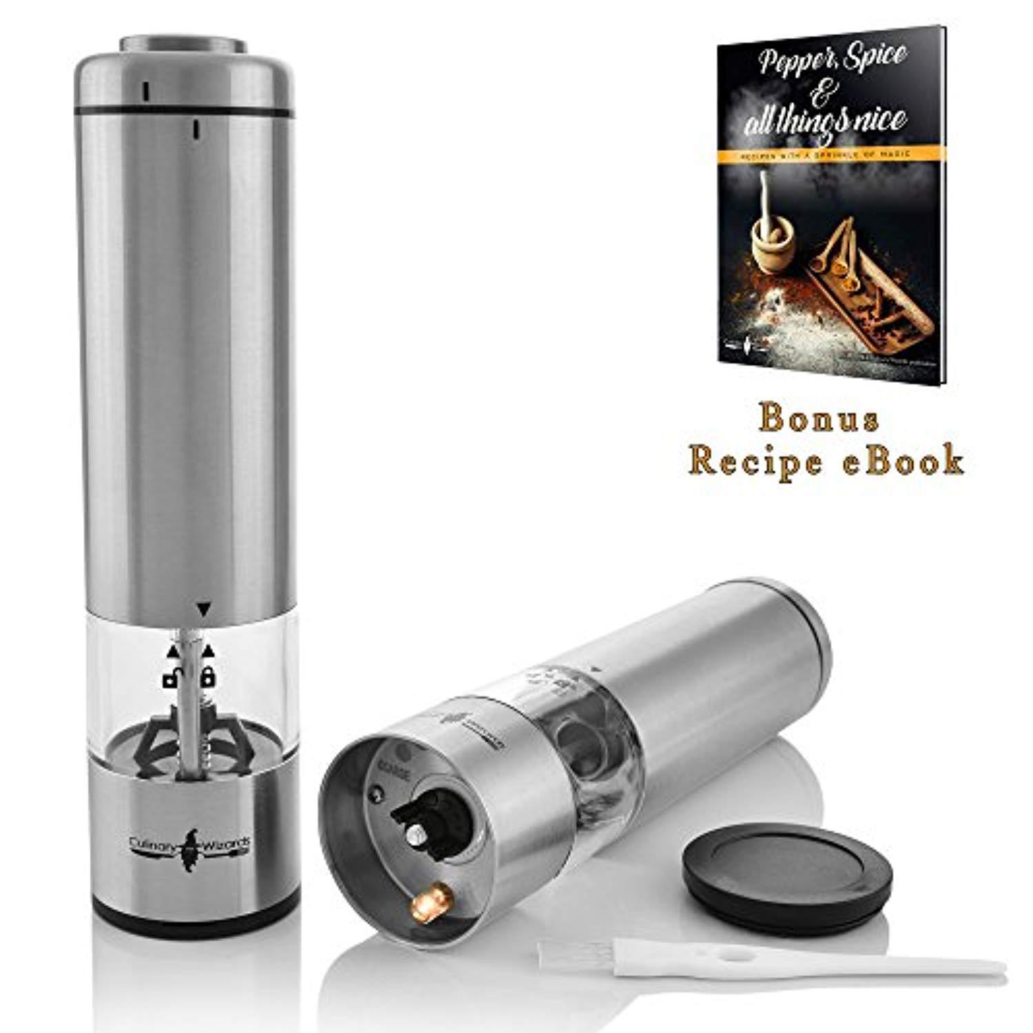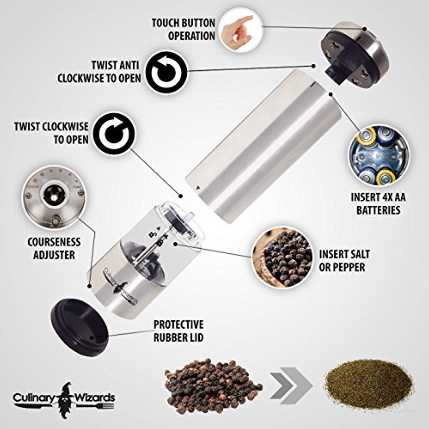 TOUCH BUTTON STYLE; The Perfect Gift for any food lover. The Culinary Wizards Electric Salt and Pepper grinders bring a touch of magic to your kitchen. Sleek design, produced with the highest quality brushed stainless steel body with transparent acrylic refill chamber and ceramic grinding core, not only do they make your life easier, they have a high end look and feel with an instant WOW factor. EFFORTLESS SEASONING; The refillable salt-and-pepper mills can be transported easily one handed in their handy, stylish Stainless steel carrier stand. In fact one finger carries both mill’s at once. Again, one handed simply press the touch button on top of each mill to start the grinding process. This also activates the built in LED light to illuminate the plate and ensure perfect seasoning every time. The accompanying instruction booklet gives you a full guide on how to operate each shaker ADJUSTABLE COARSENESS; The screw adjustment allows easy coarseness setting of the salt and pepper shakers, anticlockwise for coarse chunky seasoning or clockwise for fine powder like seasoning, or somewhere in between. Whether you use pink himalayan, white sea salt, rock salt or lemon pepper, garlic pepper or large black peppercorns, you'll be amazed at the high performance of the ceramic grinding core as it out performs traditional metal blades that clog and break FEATURE PACKED; Battery Operated; Each grinder requires 4 x AA batteries, not included. Please refer to the instruction book provided for easy installation guide. Protective rubber lids help prevent moisture into the spice chamber and keep your kitchen work tops clean. They're also very easy to refill. No mess, no fuss. Also included is a bonus cleaning brush and a free copy of our Recipe Ebook titled Pepper, Spice and all things nice. SATISFACTION GUARANTEE; NO QUESTIONS ASKED; Our customers are our Number 1 focus. That's why we offer a risk free Manufacturer 30 day money back refund guarantee and 1 year free replacement warranty. If you're happy then we're happy so please get in touch if we can help in any way. We've got you covered inside and outside the United States