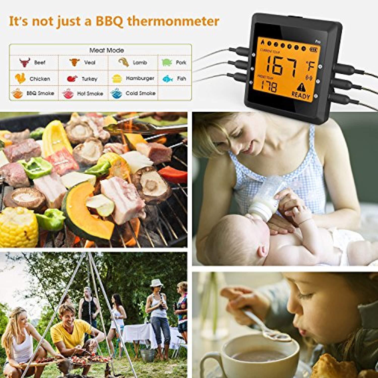 ♥WHAT YOU GET from ICOCO♥1-Year Manufacturer's Warranty and 30 days return policy for a 100% refund. Although the sensor probe is very meticulously produced, with a long-time period of use, few amount units may experience incorrect temperature readings problem caused by careless or improper use of sensor probe. We will provide you with a brand-new sensor probe, free of charge! ♥SMART APP & INSTANT READING♥ Download the free APP on your phone or tablet by searching the keyword“easy BBQ”or scan the QR code in user manual with your phone; put the ICOCO meat thermometer on the table with it holder and get temperature on your phone via Bluetooth with a range of up to 196ft(outdoor)/100ft(indoor)using the APP. Feel free to mingle at a party, do chores without standing around to check the temperature as you can get instant readings through your phone. ♥6 CHANNEL PROBES SIMULTANEOUSLY MONITORING ♥This instant read meat thermometer has 6 FOOD GRADE stainless steel probes, which can monitor different meats or grill/smoker temperature same time, 4" food grade stainless steel probe with silicone handle keeps you from burning your hands while measuring.features step-down tip design to get temperature more precisely and quickly. ♥LARGE TEMPERATURE & HIGH ACURACY♥Meat thermometer for grilling supports to enjoy your meat at a certain range of 32°F to 716°F, delivers a +/-1% accuracy level to ensure precise temperatures each time.preset Temperatures for various foods at 5 different cooking levels you can rely on, no hassle or complicated setup. This Wireless Meat Thermometer will help you to cook like a pro. ♥ENJOY YOUR BBQ TIME♥ Never worry about ruining a steak by over or under cooking or grilling. Our digital meat thermometer is equipped with an alarm and a receiver will emit a beep sound when temperature goes above your programmed range. You can confidently cook any food to perfection. Get inspired to cook and BBQ more often, be creative in the kitchen and eat healthier!