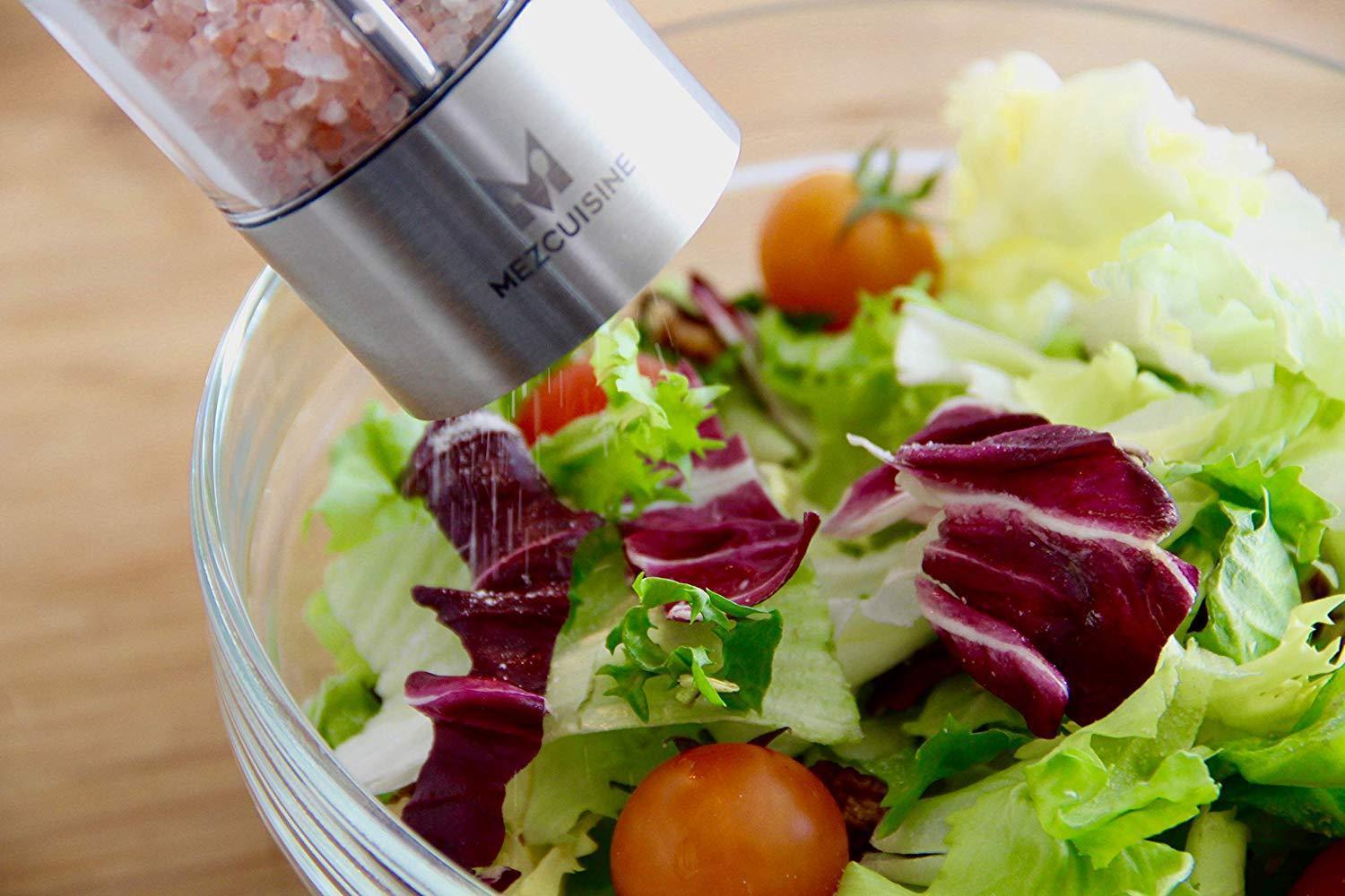 Electric Salt and Pepper Grinder Set by Mezcuisine – Premium Stainless Steel Salt&Pepper Mill Battery Operated with LED Light (Pack of 2) – Automatic Adjustable Shakers with Metal Stand