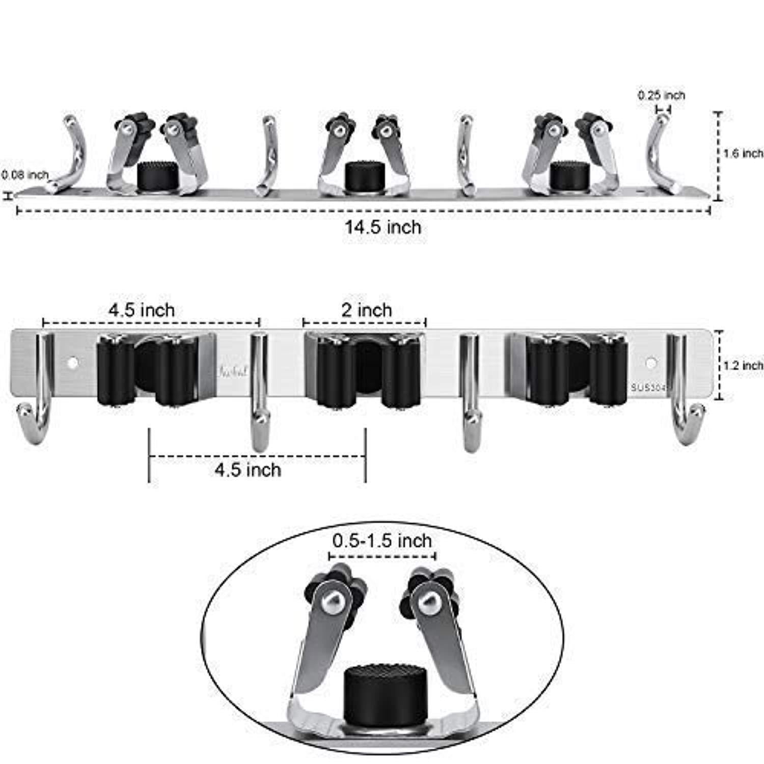 Favbal Broom Mop Holder Wall Mount Stainless Steel Wall Mounted Storage Organizer Heavy Duty Tools Hanger with 3 Racks 4 Hooks for Kitchen Bathroom Closet Garage Office Garden