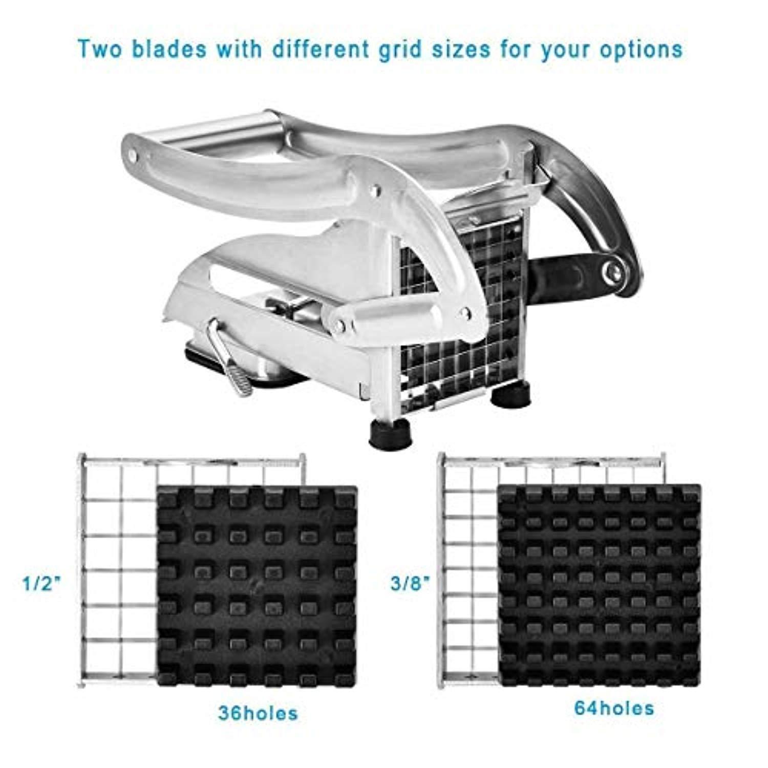 ➤ COMFORTABLE TO USE: The handle is comfortable to hold and does not slip when you used.Two sturdy replaceable stainless steel blades with 36 holes for thicker and 64 holes for thinner fries.