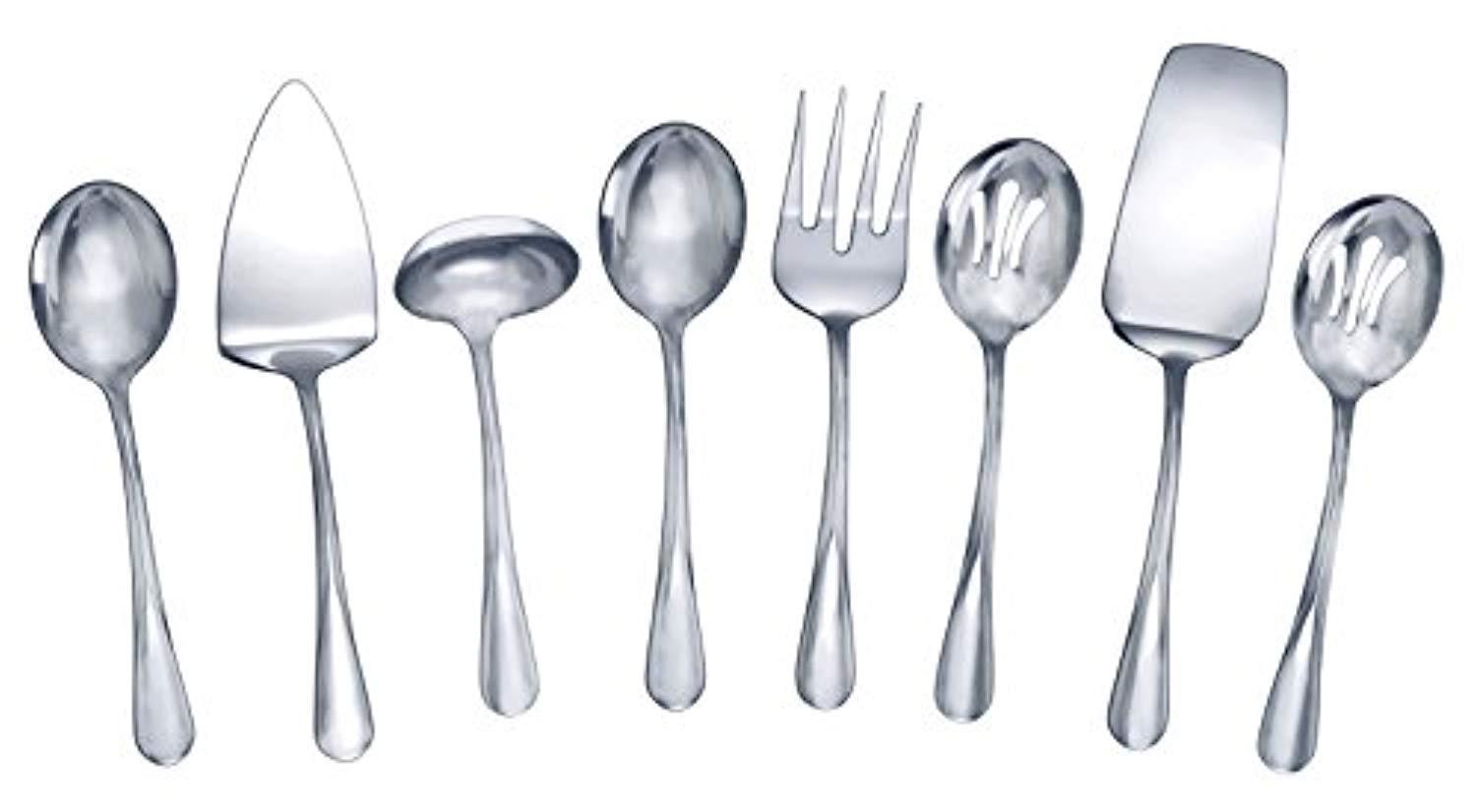 8-PIECE SERVING SET: This 8 piece serving set includes: soup ladle, lasagna server, cake server, cold meat fork, (2) tablespoons, and (2) pierced tablespoons.