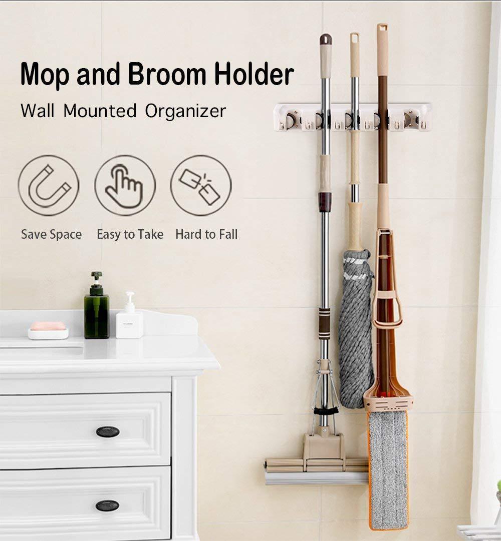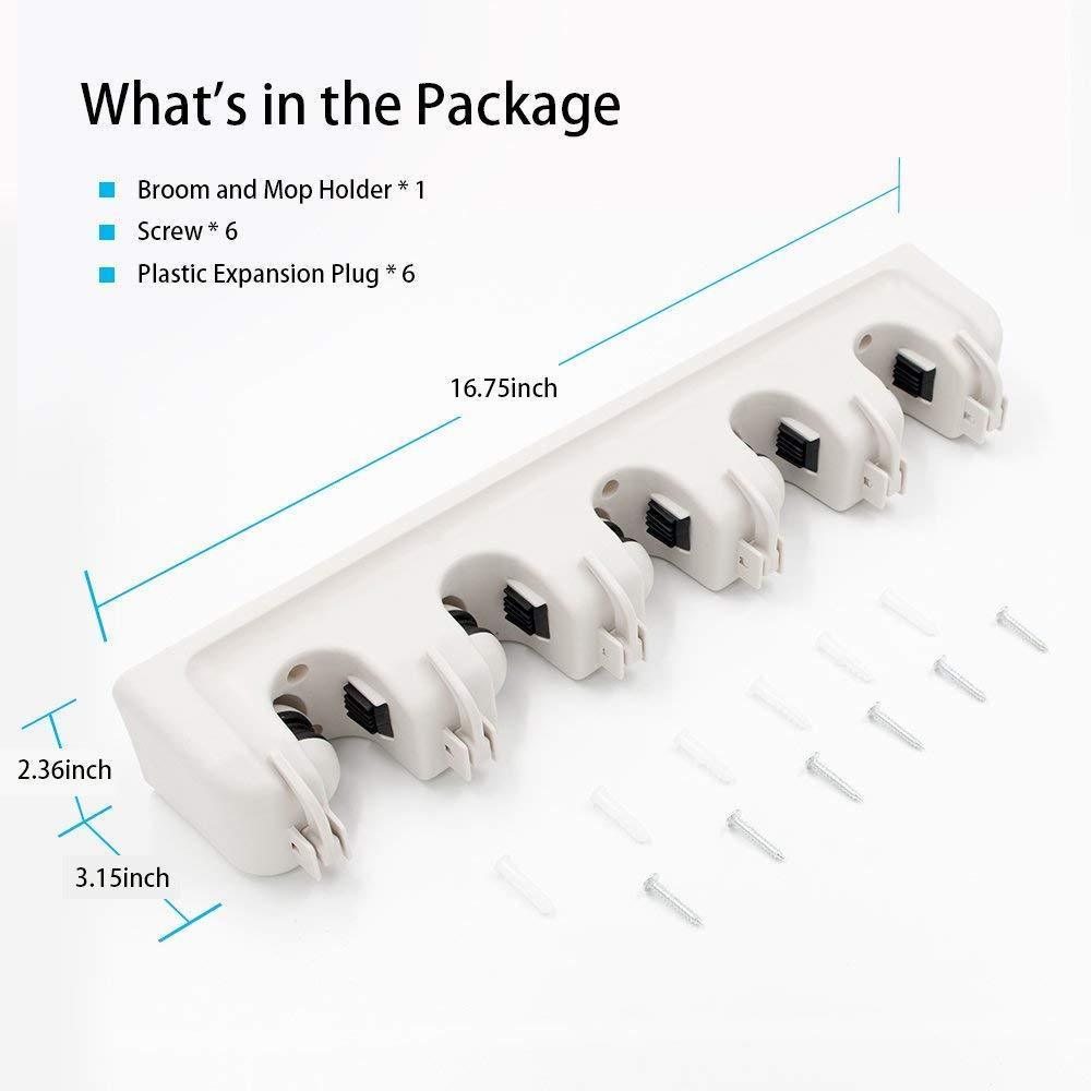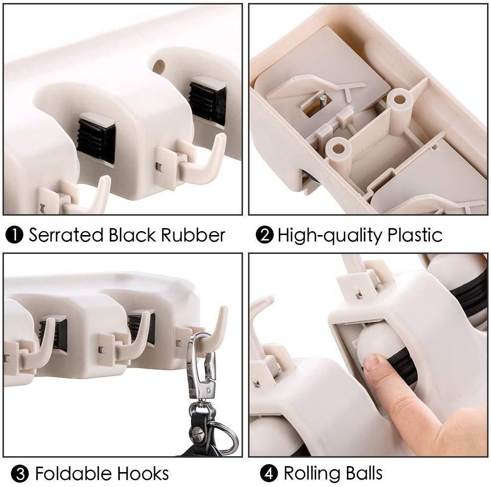 Imillet Mop and Broom Holder, Wall Mounted Organizer-Mop and Broom Storage Tool Rack with 5 Ball Slots and 6 Hooks (Gray) (Double Pack)