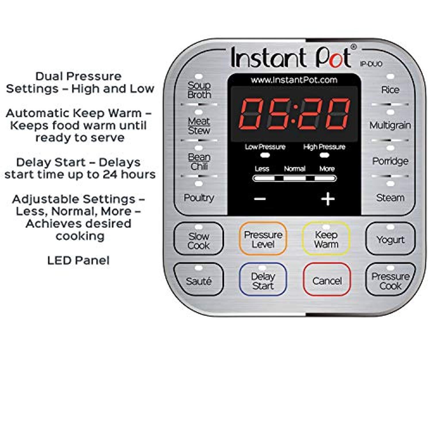Duo, the number 1 selling multi-cooker, combines 7 kitchen appliances in 1, Pressure Cooker, Slow Cooker, Rice Cooker, Steamer, Sauté, Yogurt Marker and Warmer, prepares dishes up to 70% faster to support your busy lifestyle Features 14 Smart Programs - Soup, Meat/Stew, Bean/Chili, Poultry, Sauté/Simmer, Rice, Multigrain, Porridge, Steam, Slow Cook, Keep Warm, Yogurt, Manual, and Pressure Cook. Now, your favorite dishes are as easy as pressing a button Healthy, stainless steel (18/8) inner cooking pot made from food grade 304, no chemical coating, 3-ply bottom for even heat distribution, fully sealed environment traps the flavours, nutrients and aromas within the food