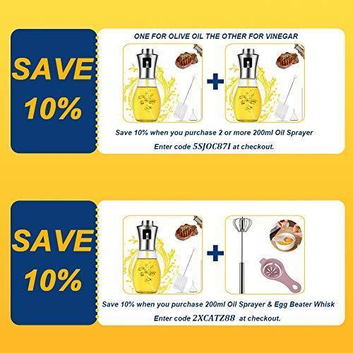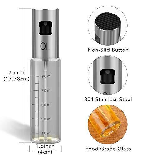 【FDA CERTIFICATION】Made from premium 304 stainless steel and glass, we ensure that the oil sprayer is completely BPA-free and eco-friendly, 100% food safety degree. 【MULTI-PURPOSE USE】 Fill the sprayer with oils/ salad oil/ sunflower oil/ olive oil/ vinegar/ soy sauce/ lemon juice/ cooking sherry wine, etc. Perfect for spraying when roasting, sauteing, baking, cooking, frying. 【HANDY TO USE】Simplely pumping action produces a fine mist to control the amount of seasoning used. With transparent and scale design, And you can recognize the remaining seasoning (oil/vinegar/sauce)quickly. Come with a funnel, this oil sprayer is reusable and easy to fill with the funnel, never drops the oil when filling 【CARRY PORTABLE】This essential oil sprayer with handled and proper size(6.76 oz capacity) can be carried outside for BBQ, picnic, party, grilling etc. 【GUARANTEE】If you have any quality problems, we will refund or replacement and process your problem within 24 hours.