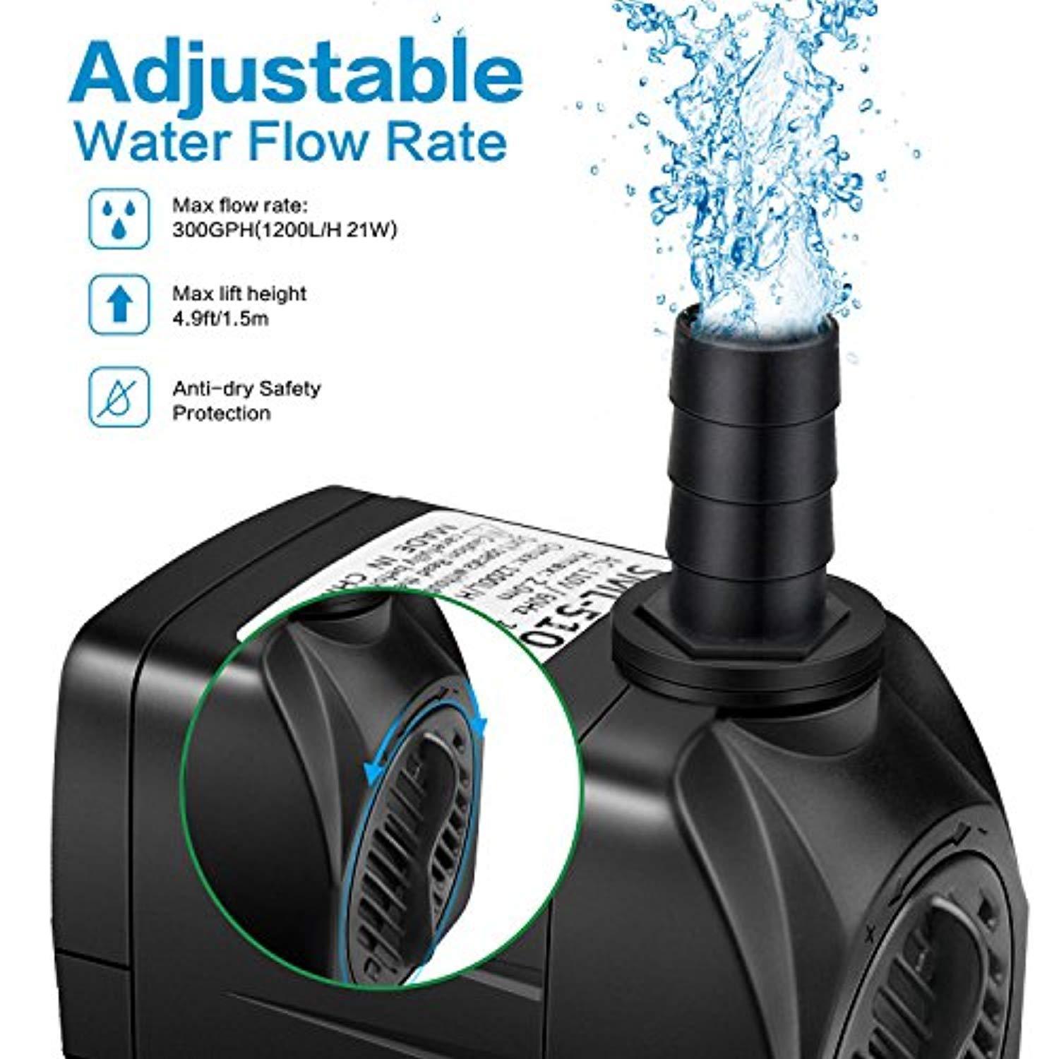 Jhua Water Pump 300GPH (1200L/H, 21W) Submersible Water Pump, Ultra Quiet Fountain Water Pump with 5.9ft Power Cord, 3 Nozzles for Aquarium, Fish Tank, Pond, Statuary, Hydroponics