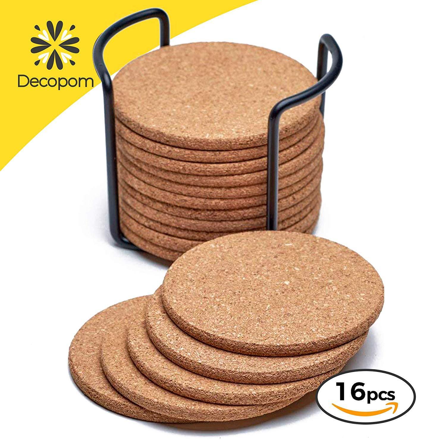 ☑️ BLACK METAL COASTER HOLDER INCLUDED: Each 16 piece set of round cork coasters comes with a coaster holder that stores them in a stacked position. Keep them organized & ready to be used for happy hour!