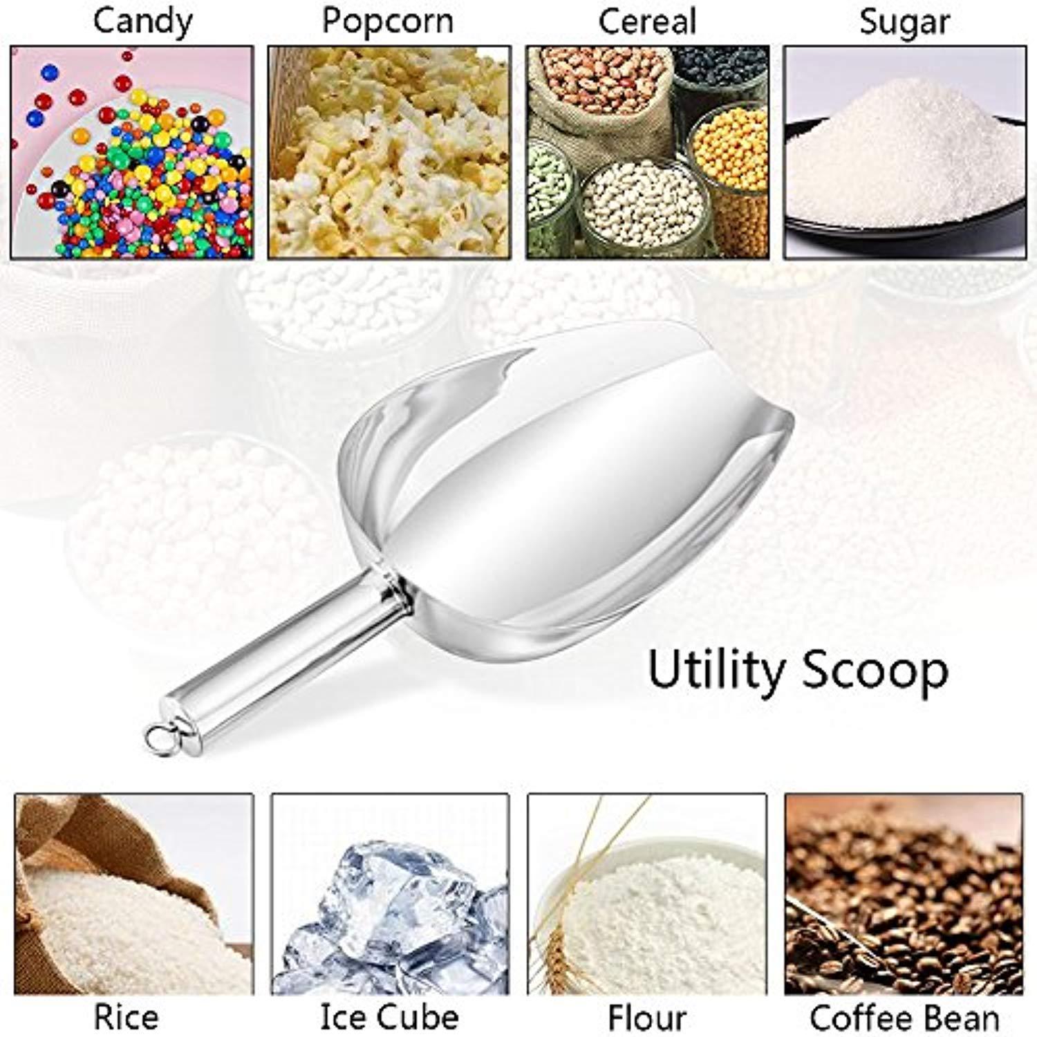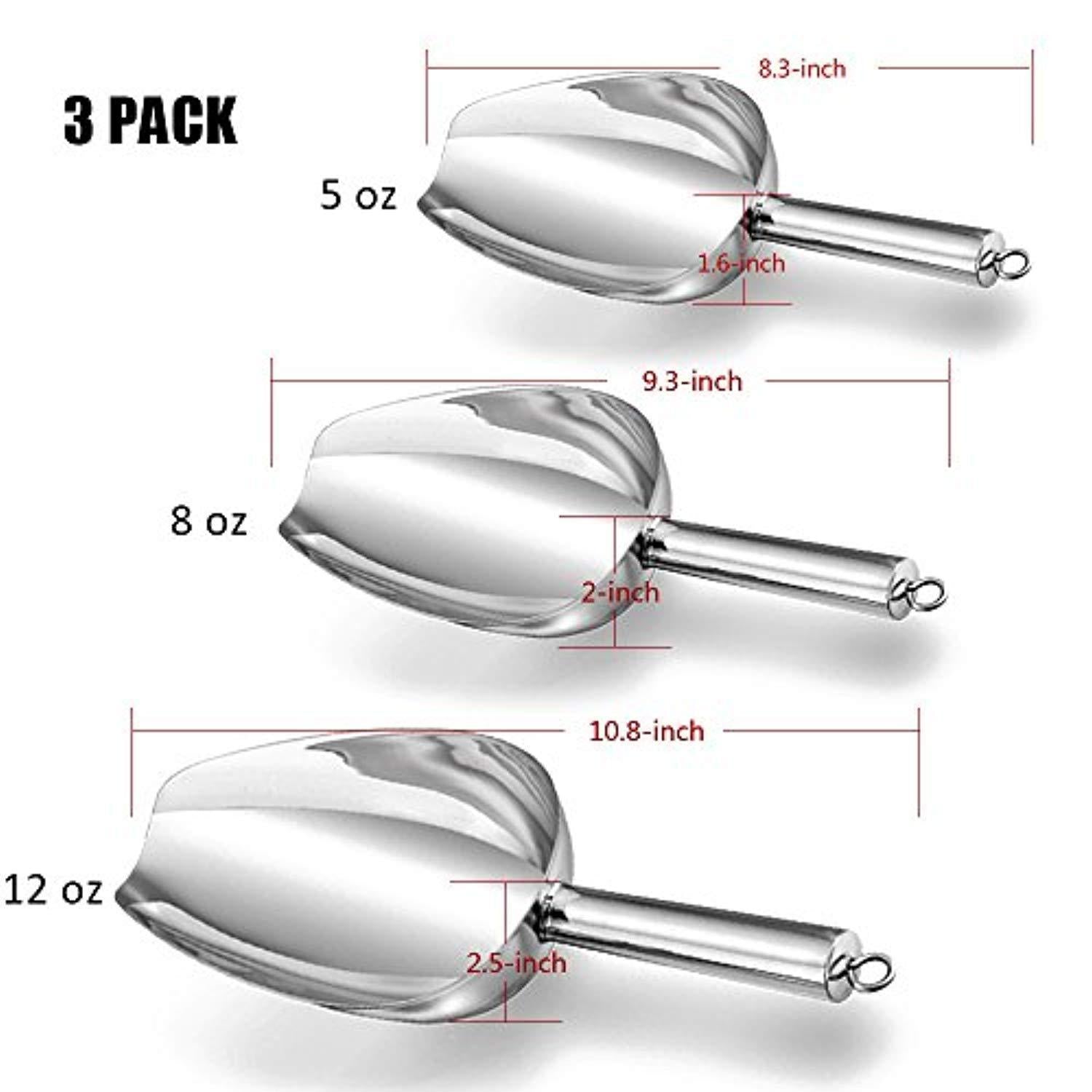 【STURDY】P&P CHEF ice scoops are constructed by pure stainless steel, Handle welded solidly to the bowl, Sturdy and unbreakable, Proper care can be durable for years 【CRAFT】Easy grip handle seamless weld to tapered bowl, Smooth rim with no rough spots, Elegant design with shiny and smooth surface 【EASY CLEAN】Dishwasher Safe, Superior mirror finish for easy clean by hand, Save your labor and time, Rust free and stay shiny after washing 【EASY STORAGE】Small loop at the end of rice scoop handle, Convenient to store and save space of your kitchen, bar counter and storage room 【MULTI SIZE】5 /8 /12 oz, Utility for Kitchen, Canteen and Shops, Proper weight and easy grip for coffee bean, candy, dry food, flour, popcorn, etc.