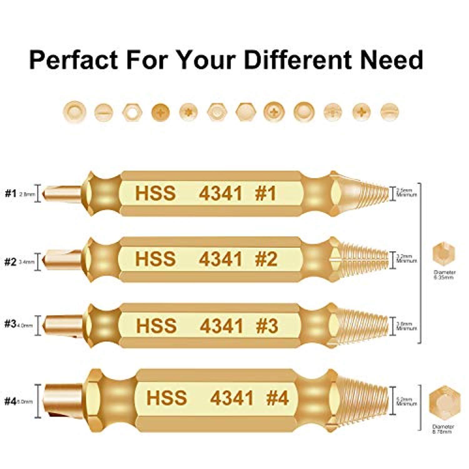 ☆ HIGH QUALITY: This screw extractor kit made from standard high speed steel and super hard titanium coated.The hardness is 63-65 HRC.Higher hardness than other brands extractors.
