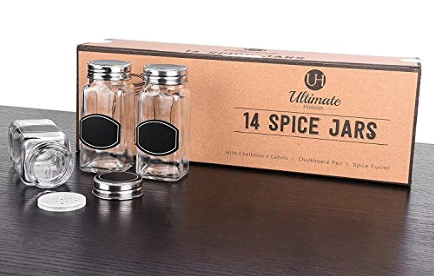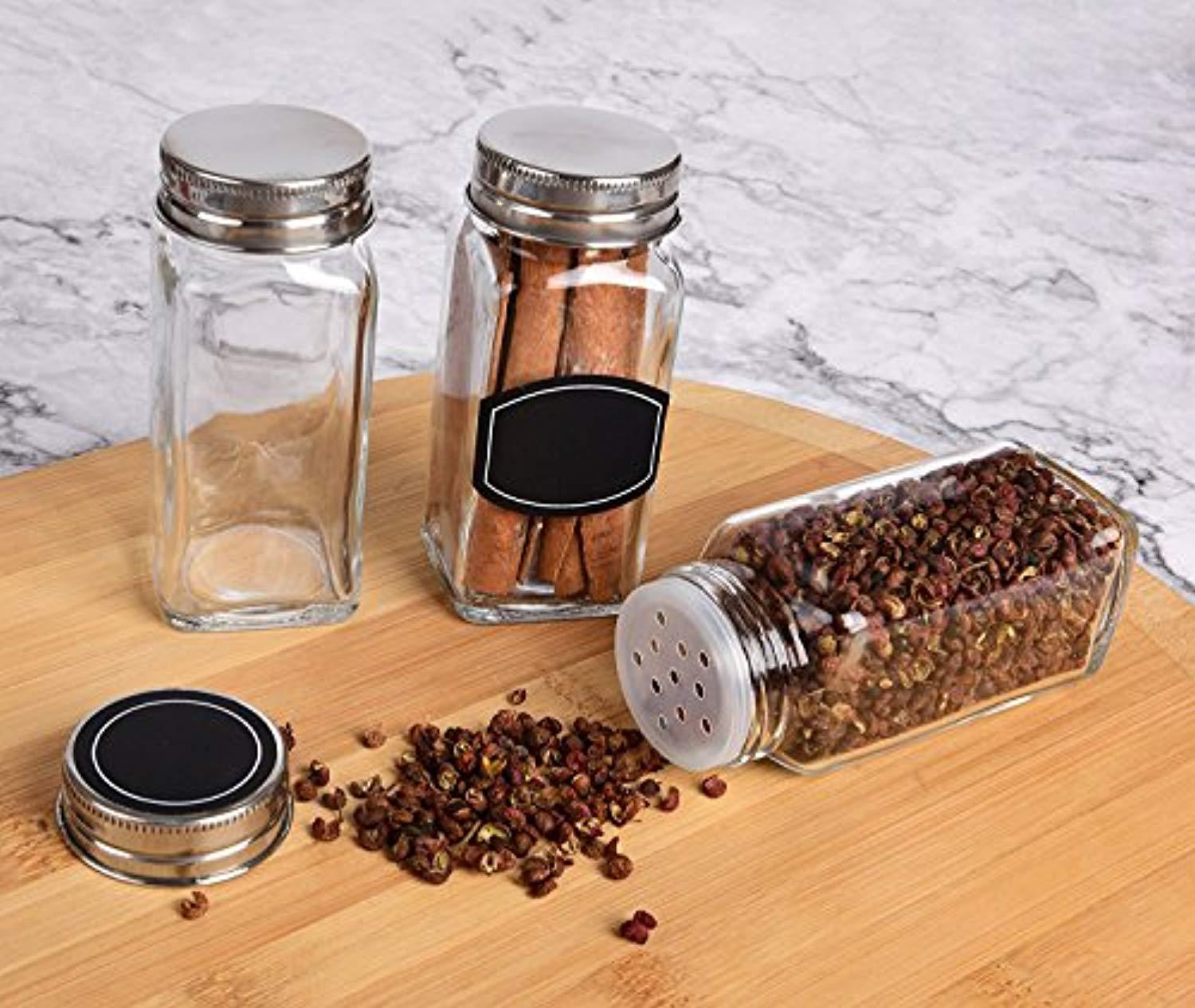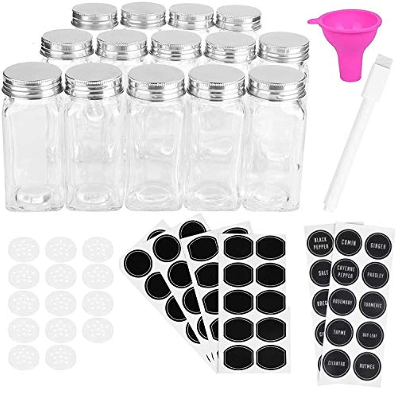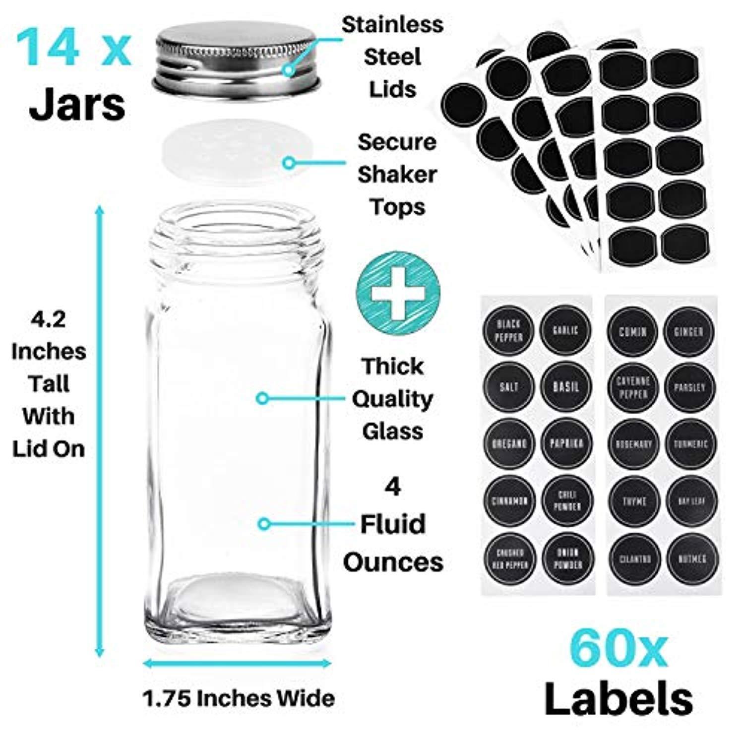 GET NEATLY AND COMPLETELY ORGANIZED - [ SET INCLUDES: 14 Storage Jars / with Tight Shaker Caps / Silver Lids / Wide Funnel / 20 Preprinted Labels / 20 Round Labels / 20 Oval Labels / Chalk Marker ] This complete jars set gives you everything you need to get all your spices and herbs neatly and efficiently organized in your spice racks, cabinets and drawers. STAINLESS STEEL LIDS MATTERS - Rust Free and Easy to Clean. Keep your contents fresh with these strong airtight lids. Unlike aluminum, iron or tin, ours is made of stainless steel. No need to worry about dents or dings - the stainless steel top will easily wipe clean and withstand every day wear and tear. STYLE FOR YOUR KITCHEN - Don't waste your time using dreary, dull plastic to house your spices. This set of 14 sleek, stylish stackable square glass containers will quickly upgrade the look and feel of your kitchen. VERSATILE AND MULTI PURPOSE - There is no limit to the variety of uses for these jars. They easily can become awesome party favors, decorative projects, or house craft, office supplies, or homemade goodies. If you're searching for a fun, thoughtful gift look no further. Each set is well packaged in an attractive box perfect for gift giving.