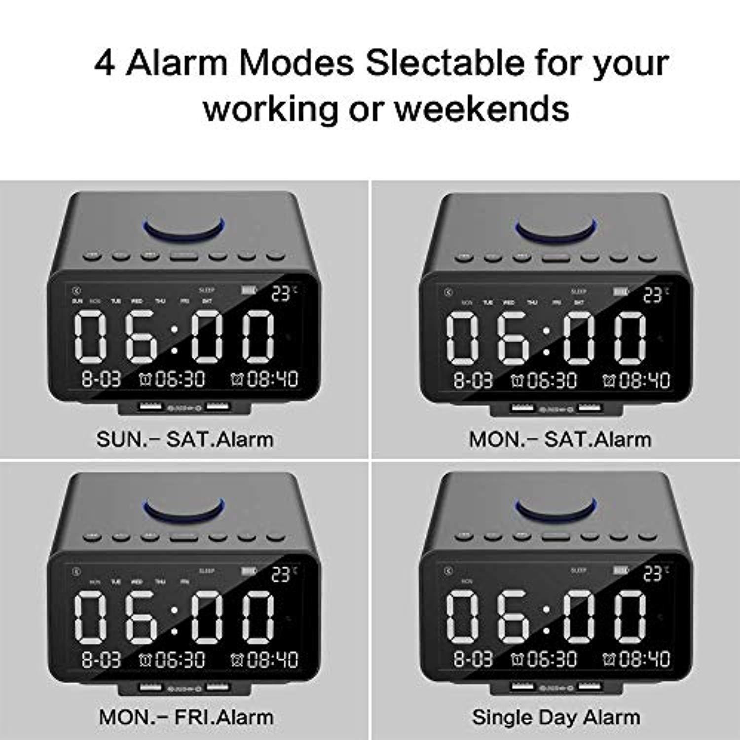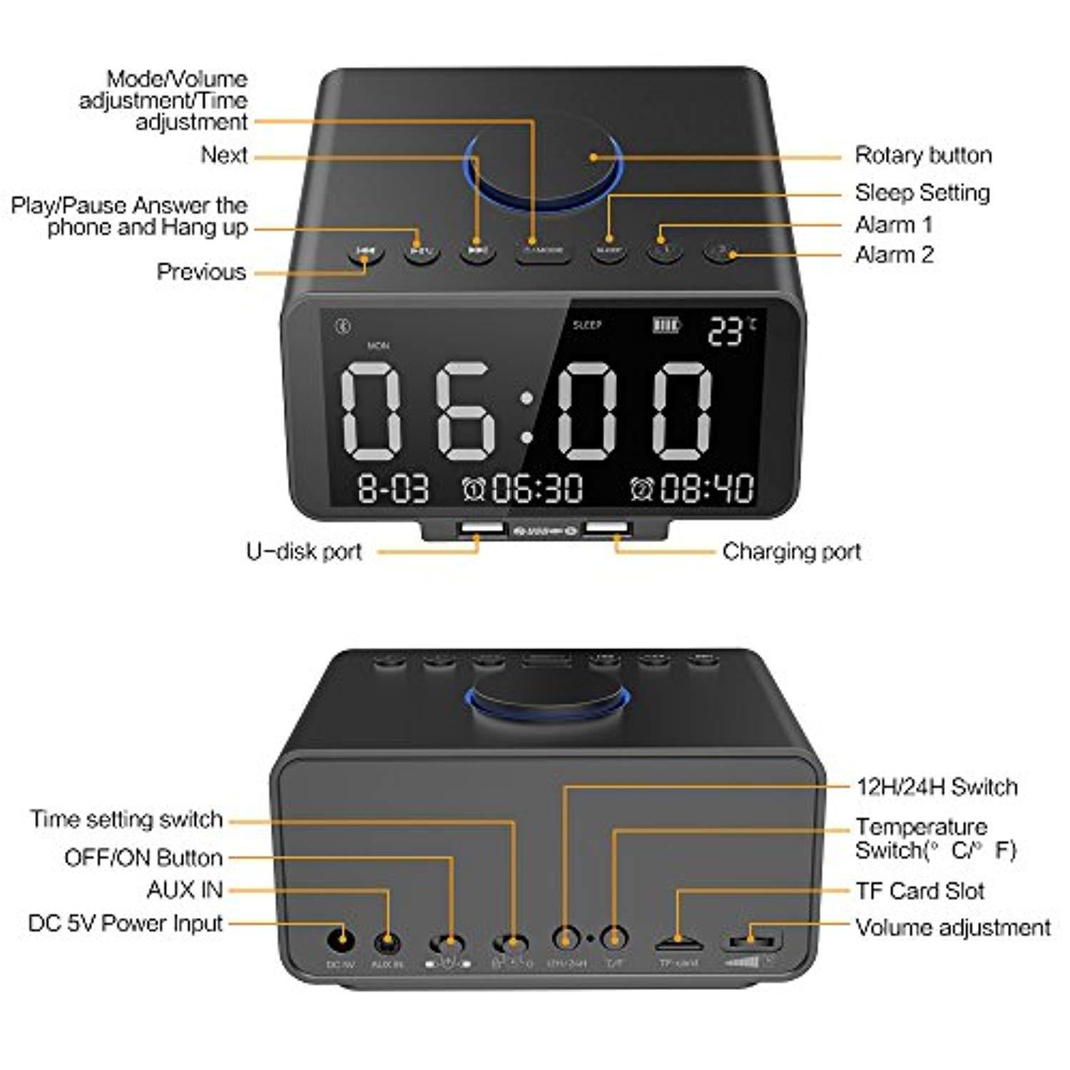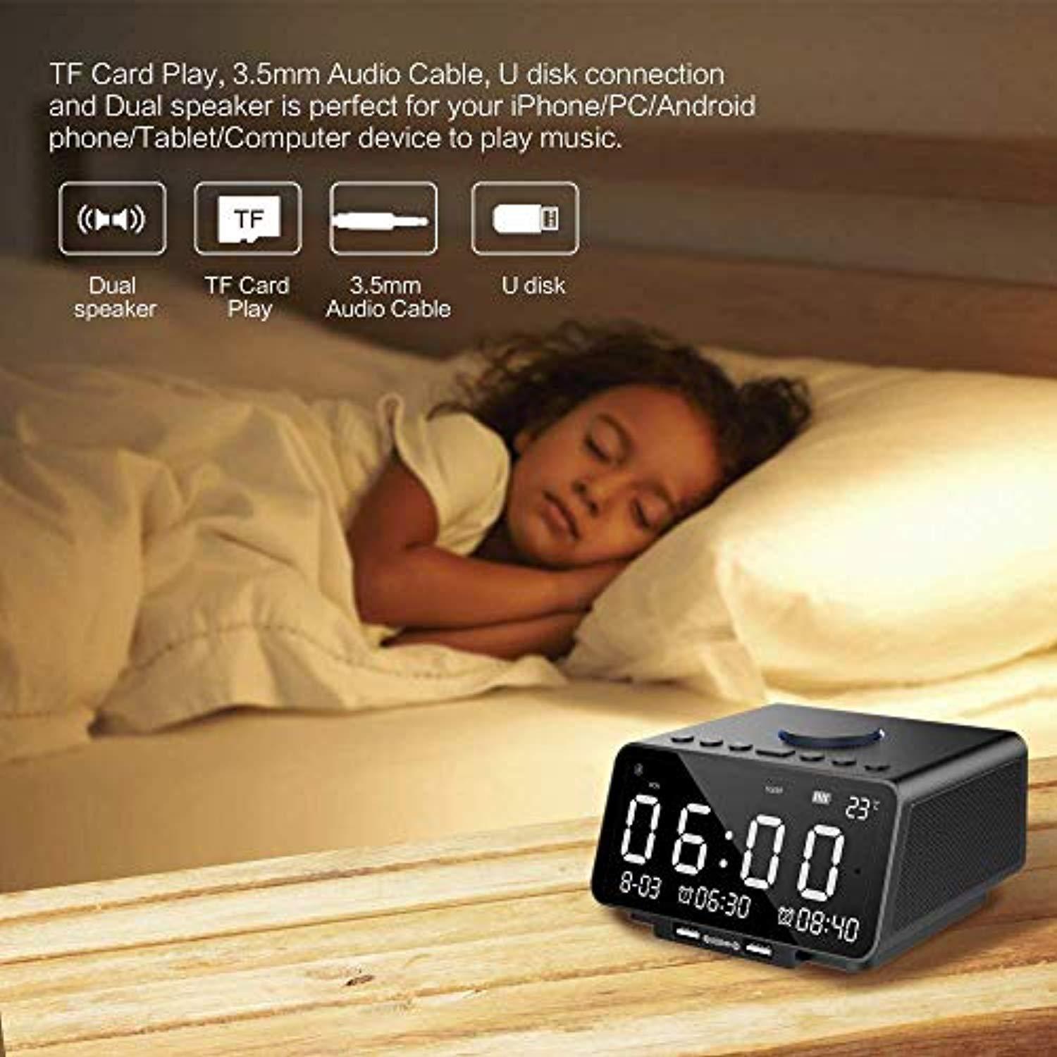 SROCKER Alarm Clock FM Radio,with Wireless Bluetooth Player,USB Fast Charge Port, TF Card Play,LED Display, Dual Alarm, Indoor Temperature/Day/Date Display,Nap/Sleep Timer for Bedroom (Black)